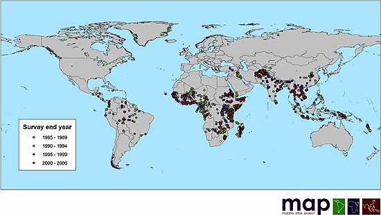 A térkép szerint 2,3 milliárd ember él maláriás területen, a világ populációjának mintegy 35%-a. Az Anopheles moszkitó által terjesztett parazita rengeteg embert betegít meg évek óta, minden esztendőben 500 millió maláriás megbetegedést jelentenek, ebből egymillió beteg meg is hal. Különösen veszélyes ez a betegség a gyermekekre a szub-szaharai afrikai régióban.